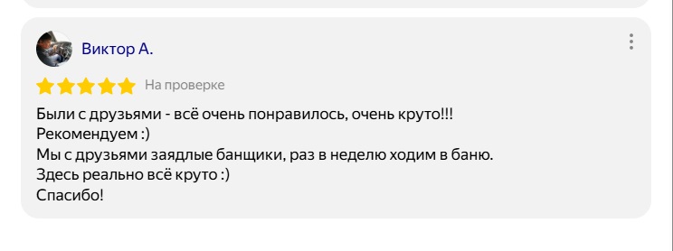 Были с друзьями - всё очень понравилось, очень круто!!! Рекомендуем :) Мы с друзьями заядлые банщики, раз в неделю ходим в баню. Здесь реально всё круто :) Спасибо!